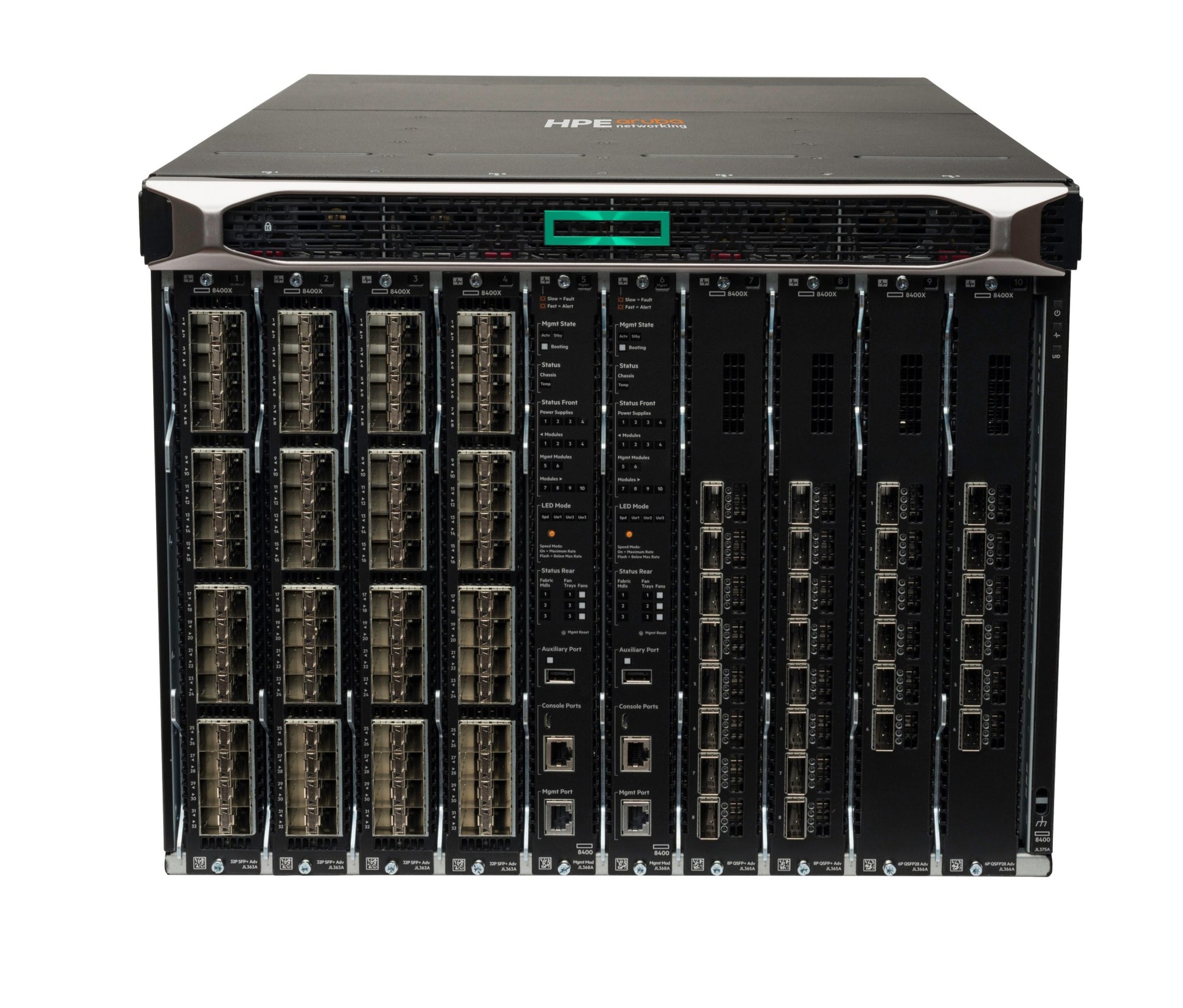 Modular core switch bundle built on an 8-slot chassis, pre-populated for high-performance aggregation. Includes 1x management module, 2x 8400X fabric modules, 1x 32-port 10GbE SFP+ line card, 1x 8-port 40GbE QSFP+ line card, and 3x hot-swap power supplies for resilient operation.
