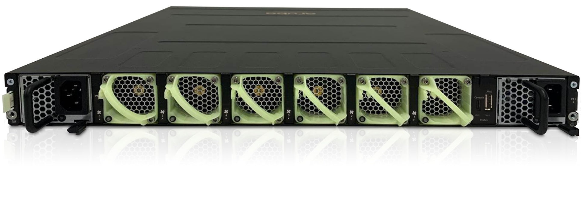 Hot-swappable AC power supply with front-to-back (port-to-power) airflow for high-availability deployments. Auto-ranging 100–240V input supports global power standards and N+1 redundancy when paired. Designed for quiet, efficient cooling and rapid replacement via tool-less latch.