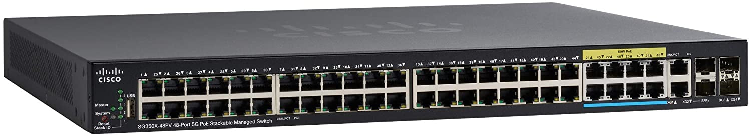 Cisco SG350X-48PV-K9-AU | 48x 1G PoE+ | 4x 10G uplinks | L3 managed, stacking | License: included