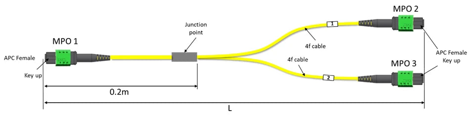 - Configuration: MPO‑12 APC to 2x MPO‑12 APC (dual‑leg harness)